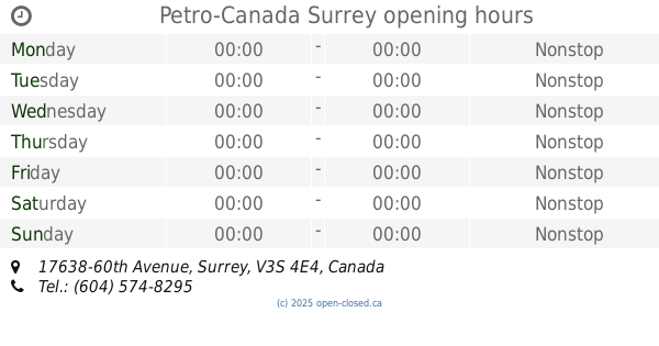 It is also possible to : Edit these OPENING HOURS of Station Petro-Canada In Surrey, 17638-60th Avenue,